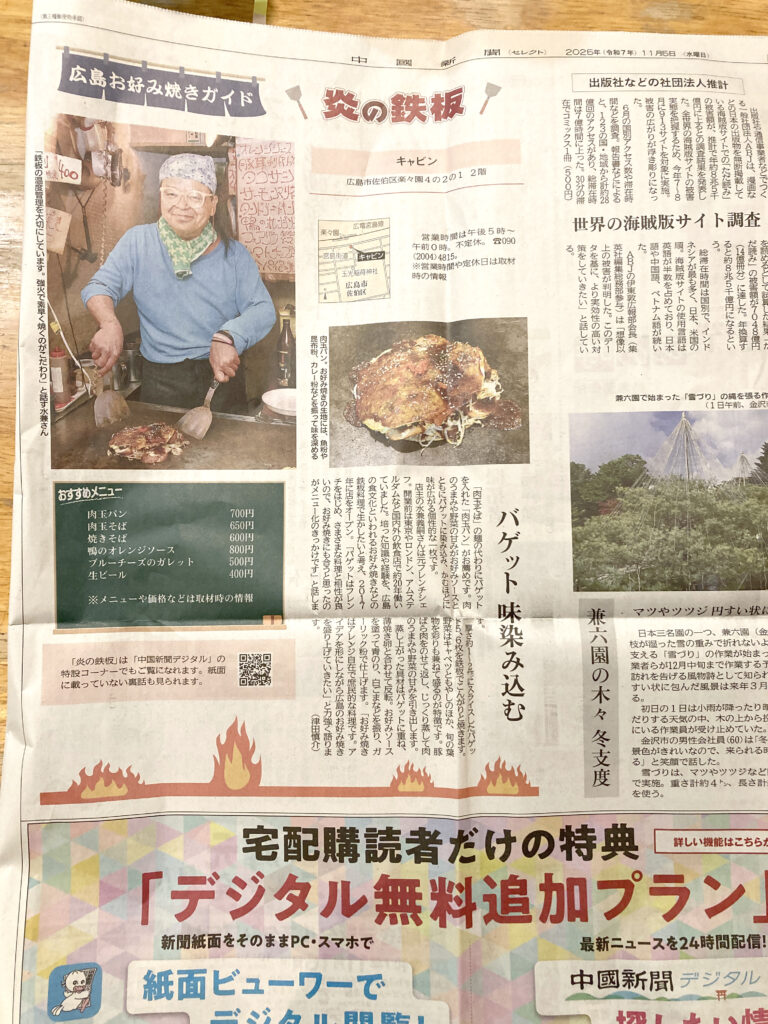 そんなキャビンさんがこの度、地元の有力紙・中国新聞の地元のお好み焼き屋さんを紹介するコーナー「広島お好み焼きガイド・炎の鉄板」に取り上げられました〜〜パチパチ。