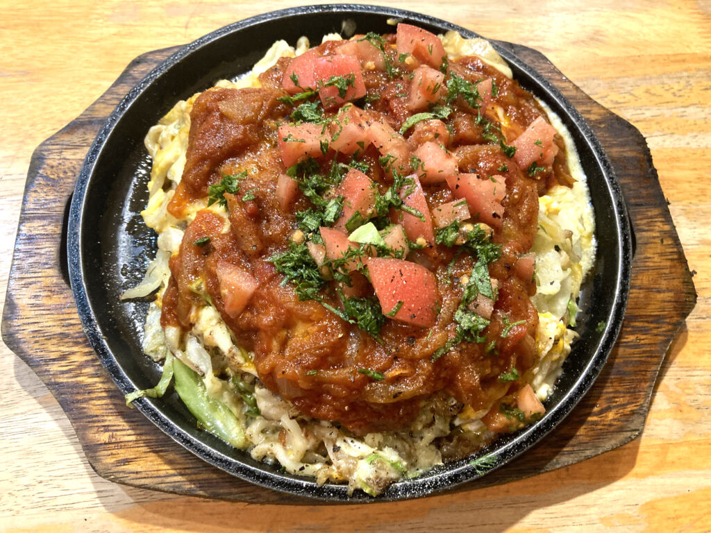 この日Roomin’が注文した最近どハマりしている「気まぐれお好み焼き」もトマトやハープがあしらわれ、どこぞ海外の料理にもありそうな気配が漂っておりました。食べると確かにお好み焼きなのですが見た目の通りトマトがたっぷり入っているのでヘルシーで遅い時間にも食べても大丈夫な感覚でした!
