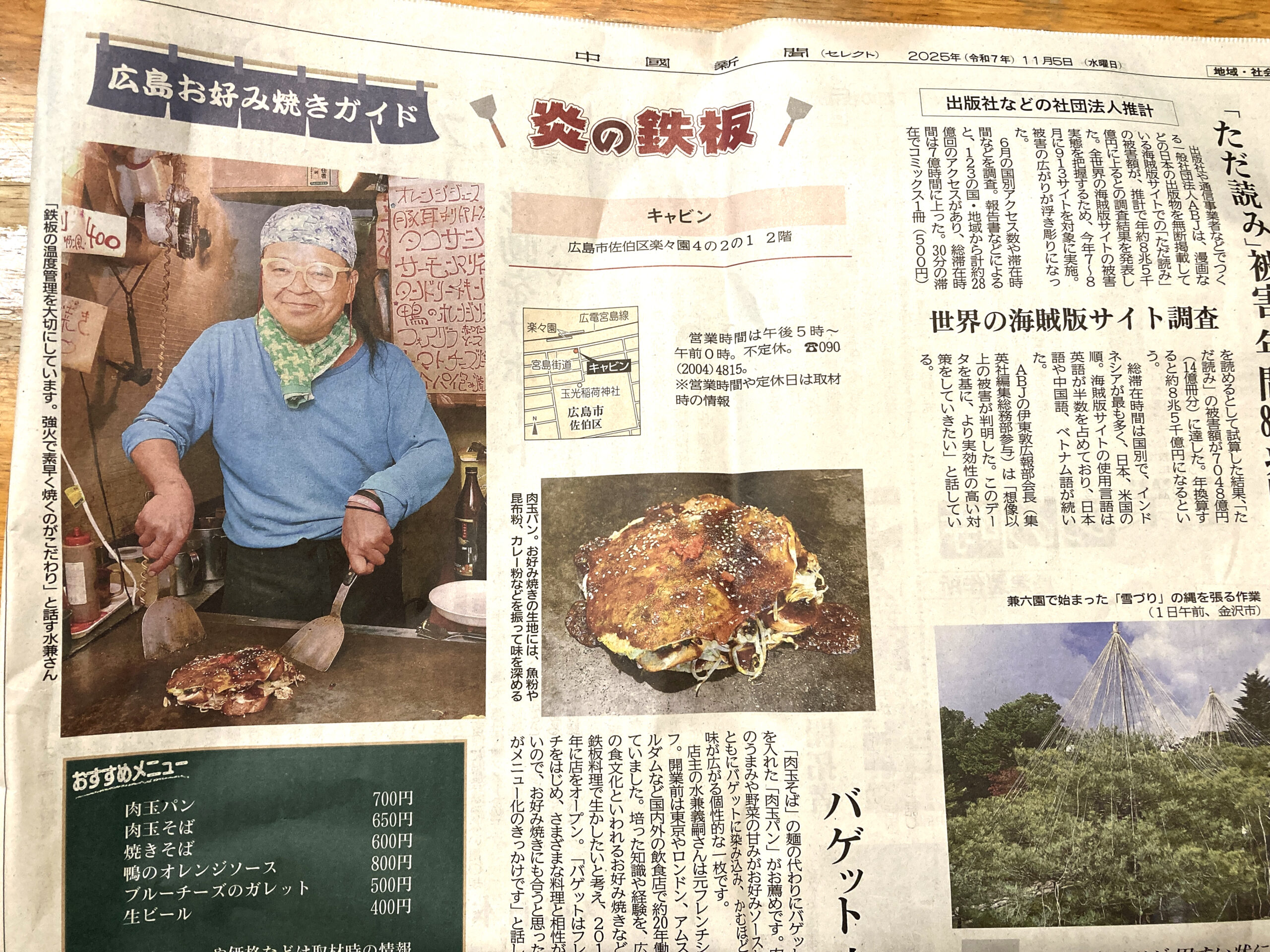 そんなキャビンさんがこの度、地元の有力紙・中国新聞の地元のお好み焼き屋さんを紹介するコーナー「広島お好み焼きガイド・炎の鉄板」に取り上げられました〜〜パチパチ。