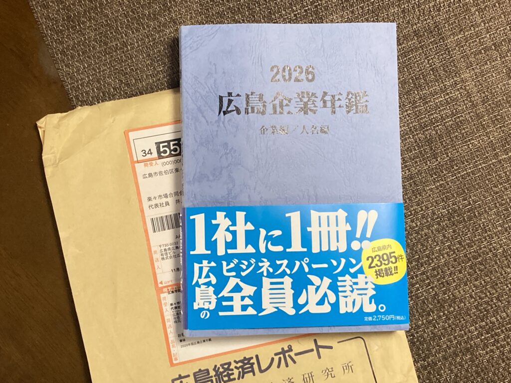 同誌は広島県内の2,000社以上の企業の会社概要や決算、役員略歴などを掲載するもので、そんなものに掲載いただけるという誠にありがたいお話。(ちなみに広島経済レポートも広島企業年鑑も掲載は無料です。)原稿そのものはボリュームのあるものでもなく送稿完了してしばらく経過、忘れかけていた頃に書籍小包が届きました。