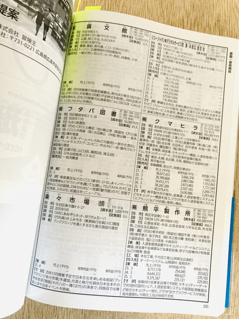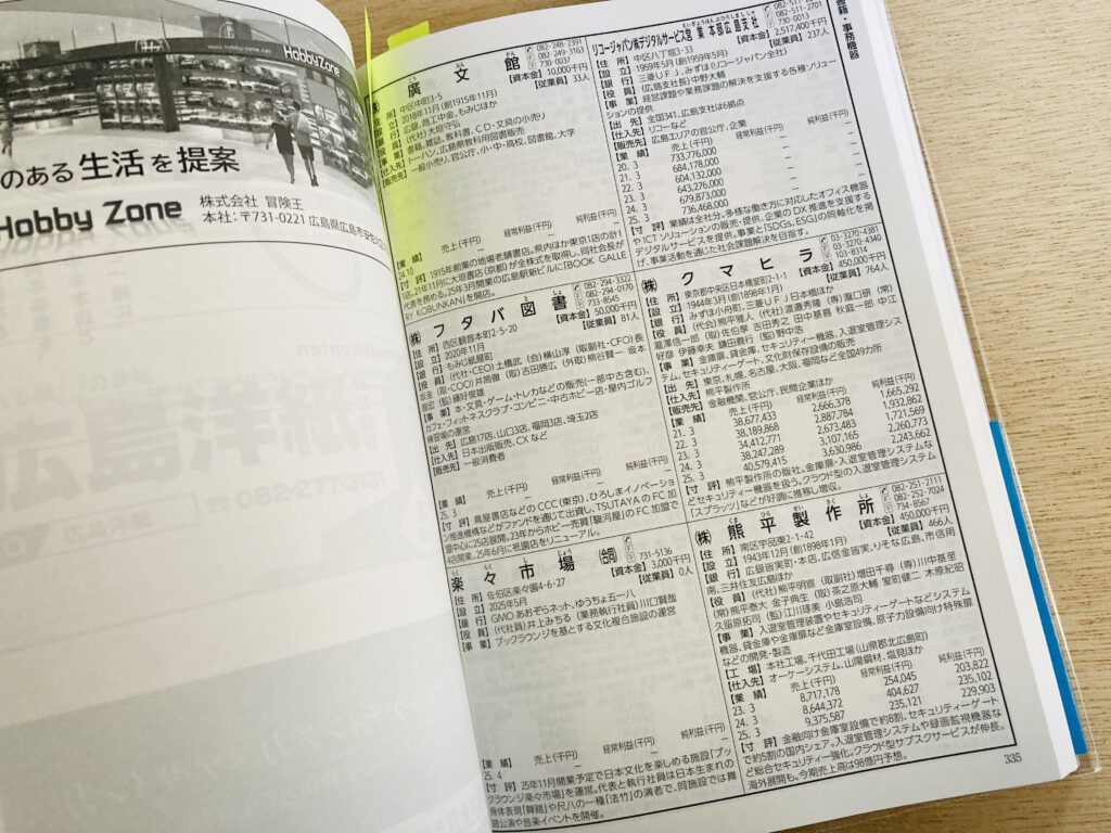 発行日である11月14日にバッチリお届けいただいた広島企業年鑑。掲載初回は無料で一冊いただけるということで大事な一冊にまずは透明のカバーをつけます。そして中面をチェック。内容は会社概要と決算を業種別に掲載した「企業編」と役員の略歴を五十音順で掲載した「人名編」の大きく2分類に分かれており、まずは企業編をチェック。なかなか見つからないな〜と思っておりましたところ、楽々市場の業種をどうやら「本」に分類してくれていたようで「書籍・事務機器」のカテゴリーにて発見。