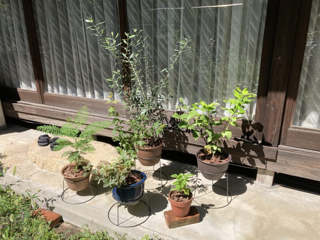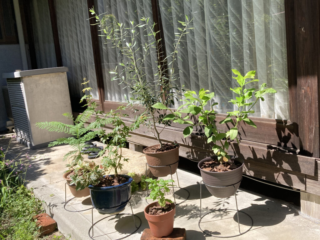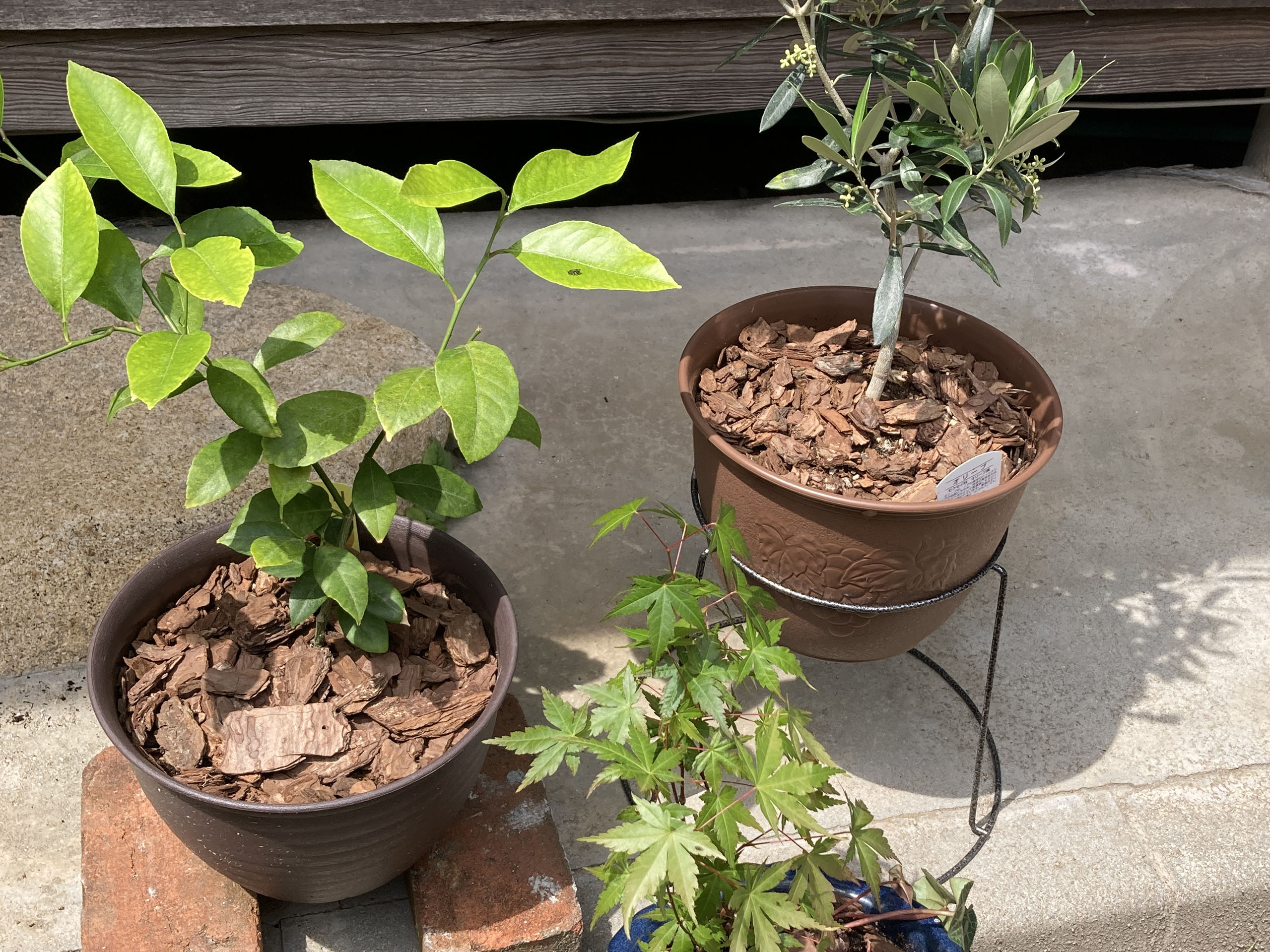 水やりは土がカラカラに乾いてから下から抜けるくらいたっぷりと。特にオリーブとレモンは乾燥気味で。それさえ守っておけば特に気にしなくても大丈夫。日当たり良過ぎると水やりが大変なので夏は北側に置いてあげました。