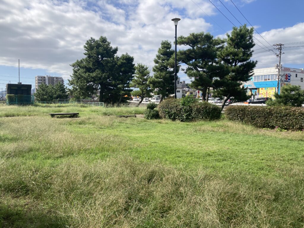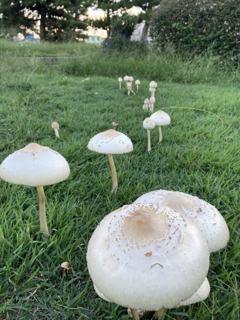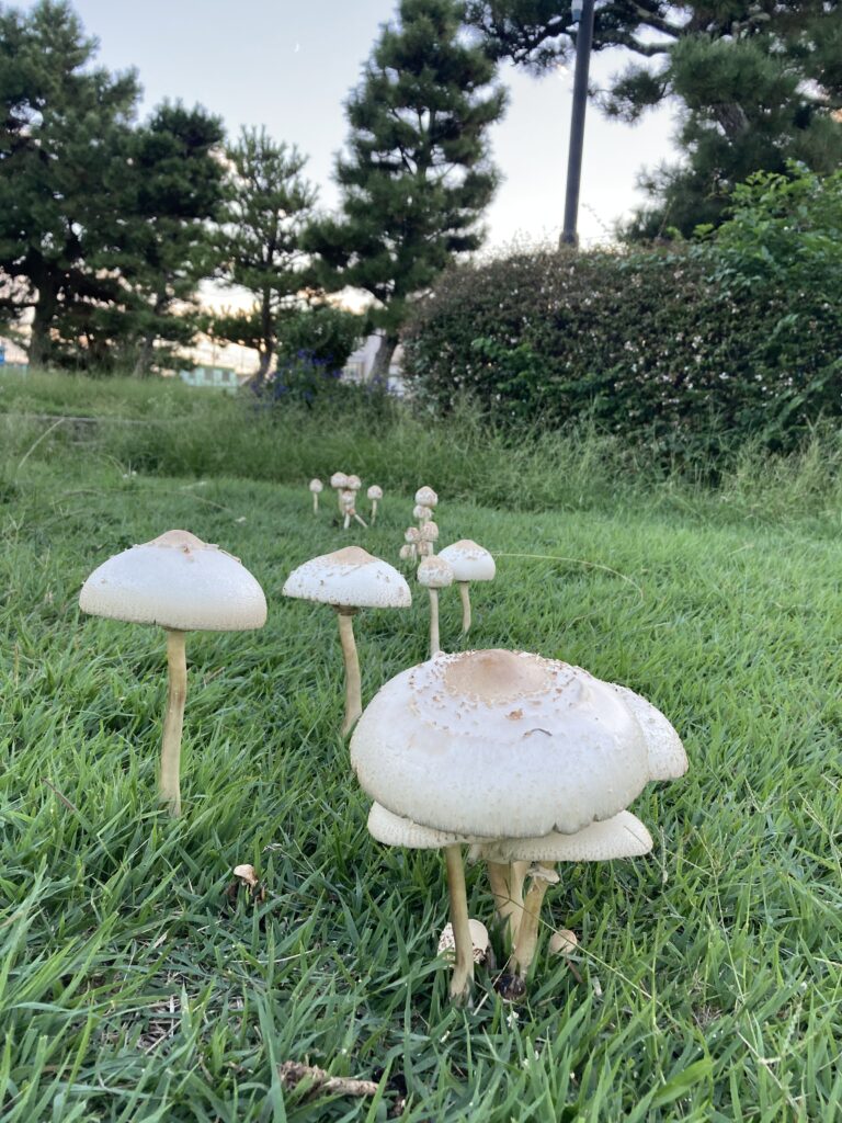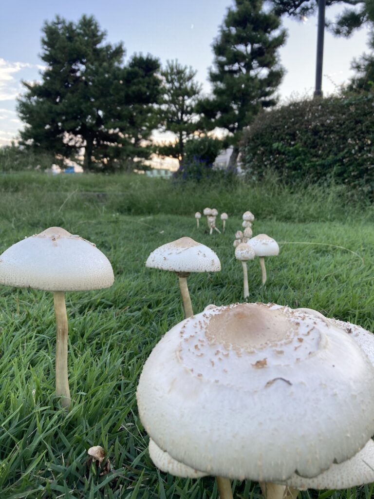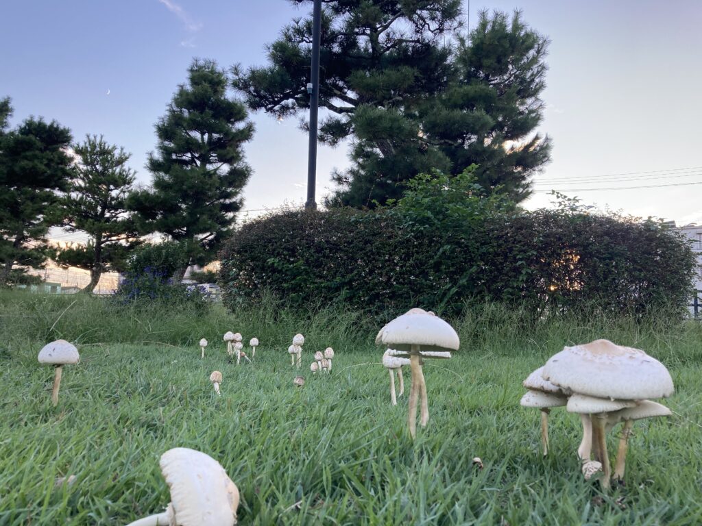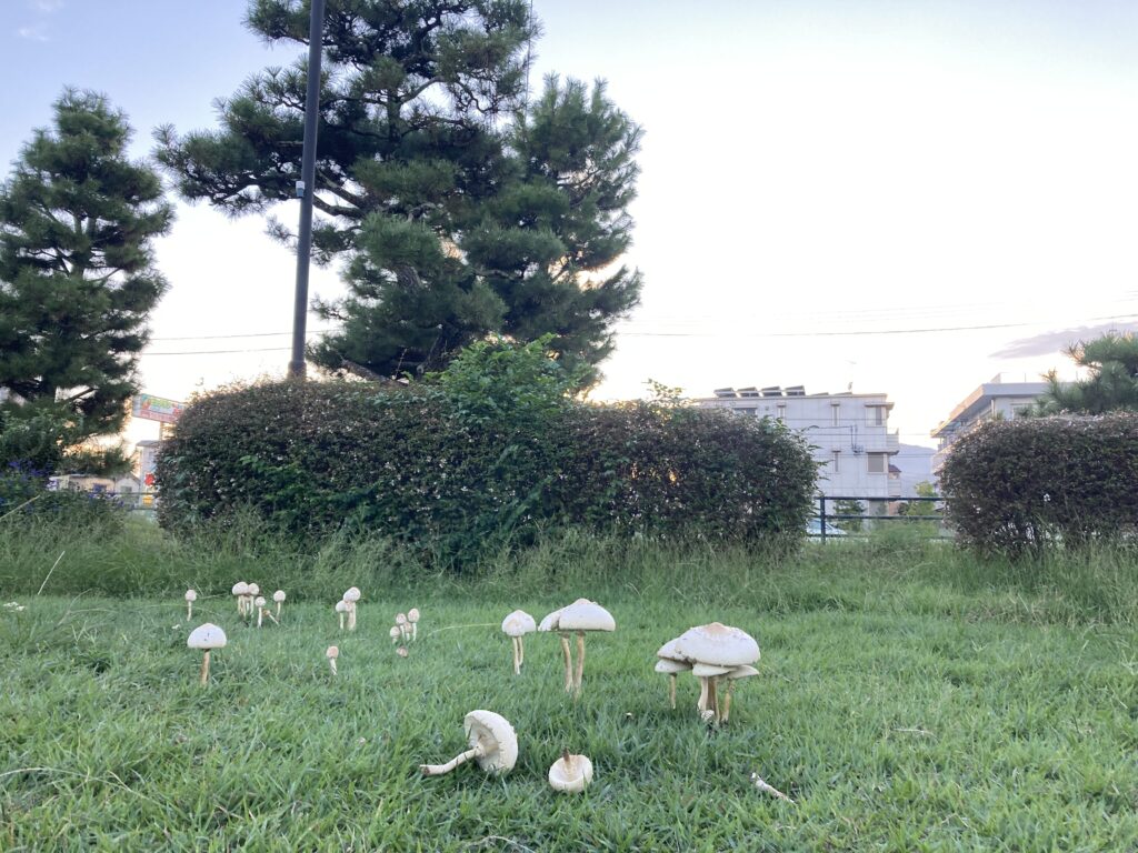 楽々園の北側、広島工業大学の手前のダイレックス五日市店にいく際にいつも通る岡の下緑地。9月のお彼岸すぎに通ったところ、いつもは芝生や草で覆われた緑地に「きのこの群れ」が突然出現。