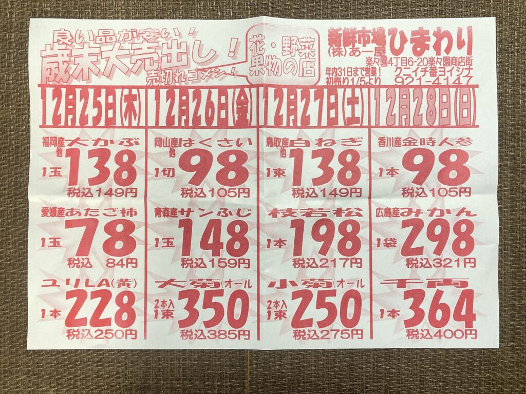 年末用特別スタイルのチラシ。普段は隔日で更新。