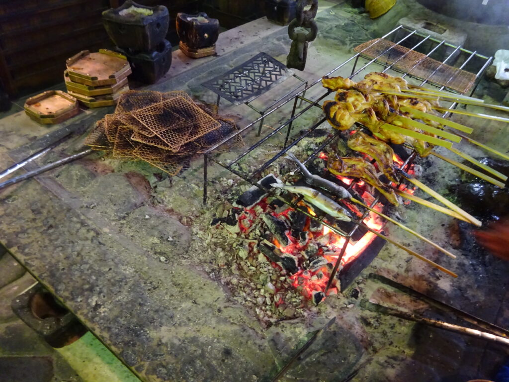 外の席もありましたが寒いので炭の香りが漂う店内のお座敷へ。そばに囲炉裏があり見た目も暖かい・・・鶏肉を串に刺した山賊焼が次々と焼かれている様子、鮎の塩焼きもあり、ザ・囲炉裏料理の風格です。