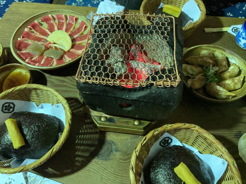 我々は「山賊焼」&「山賊むすび」の組み合わせで注文。餃子と「ひちりん」という焼き肉もつけていただきました。席で炭火焼きできるので皆でワイワイ楽しみつつ、ていうかおむすびでか・・・!山賊焼は皮がパリっとしていて見た目のワイルドさより食べやすく美味しくいただきました。