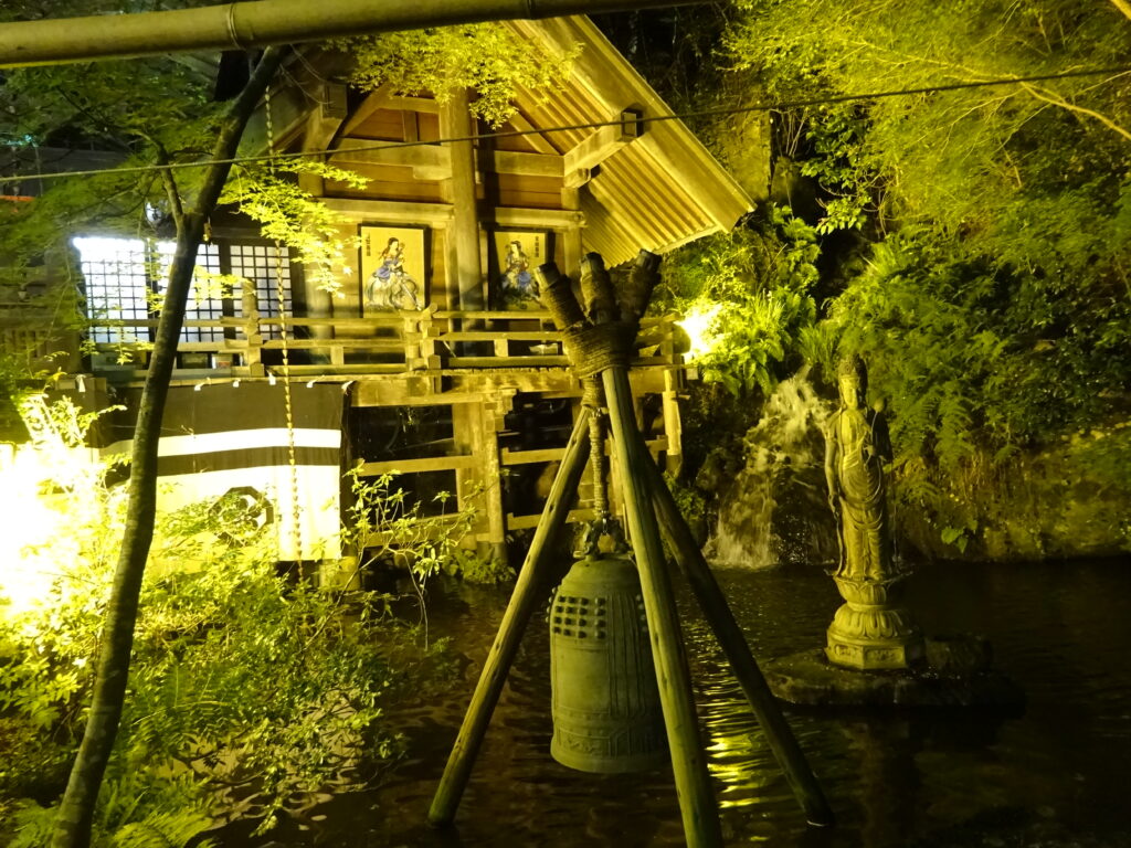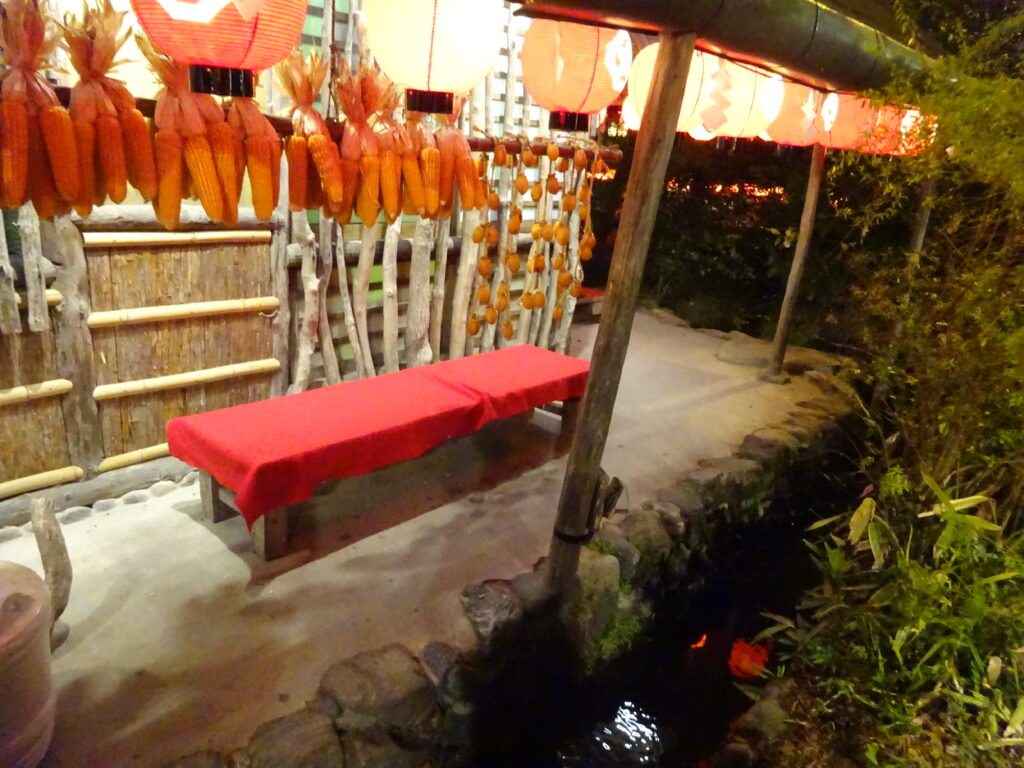 我々がいく予定の「いろり山賊」の他にも別の山賊店舗がどこまでも続いていてまるで無限城に迷い込んだかのような感覚。和風庭園の滝の前にこたつ席が並んでいて外で食事していたり、寺のような建物やら城のような建物やら、いい加減にせぇよとツッコミを入れたくなるような光景が広がります。