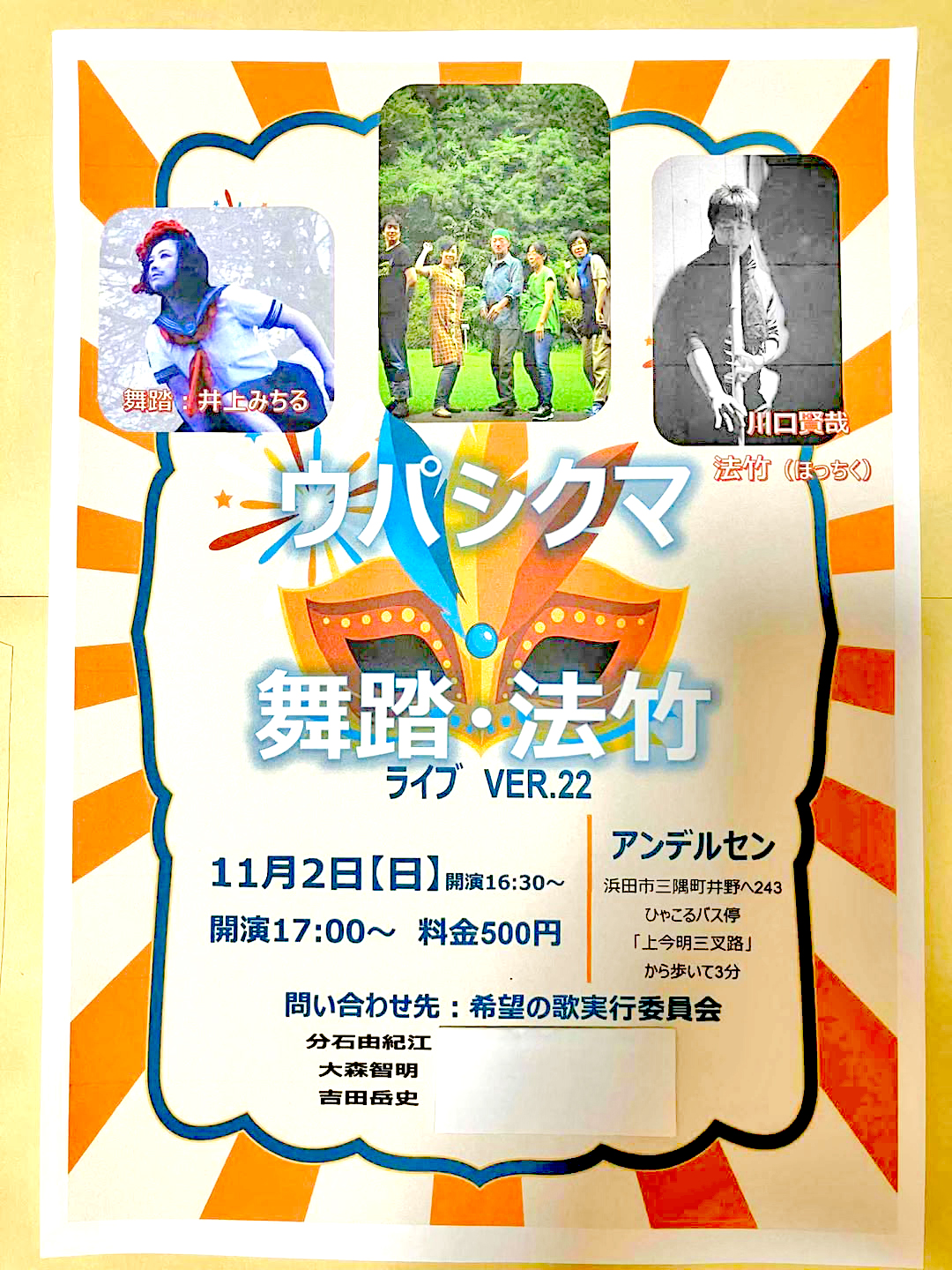 広島の老舗ライブスペースOTIS!の佐伯さん率いるウパシクマとご一緒させていただき、初めて島根県の浜田アンデルセンに登場します。静かな里山にありながら過去におおたか静流さんやサックスの梅津和時さんら大物ミュージシャンも出演されたという伝説的(?)な場所に立たせていただきます。