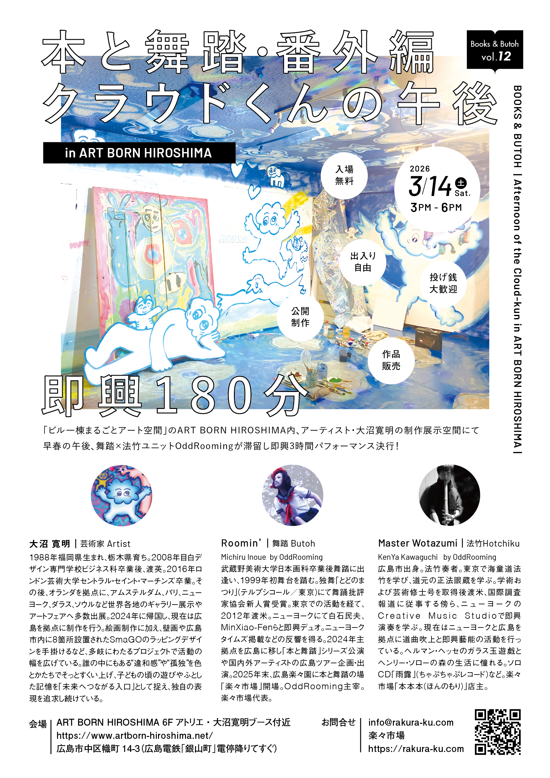 「ビル一棟まるごとアート空間」のART BORN HIROSHIMA内、アーティスト・大沼寛明の制作展示空間にて早春の午後、舞踏×法竹ユニットOddRoomingが滞留し即興3時間パフォーマンスを開催します。「クラウドくん」たちと紡ぐ今この瞬間に生まれる「場」にぜひお立ちあいください。ART BORN HIROSHIMA内には他にも複数のアトリエやギャラリーがありますので様々な作家の方々の制作・展示現場もご覧いただけます。入場無料、出入りは自由ですのでどうぞお気軽に!
